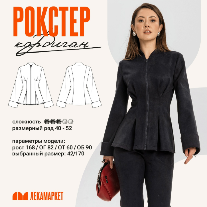 Кардиган приталенного силуэта, длиной выше линии бедер, с цельнокроенной стойкой. На полочках – встречные складки, застроченные на уровне талии. На спинке – рельефы, выходящие из плечевого шва. По горловине – цельнокроенная стойка с закругленными краями по полочке, приходящими в одну точку, — начало застежки. Застежка центральная, бортовая, на тесьму-молния. Рукав втачной, одношовный, расширенный к низу. По низу рукава широкий отворот, высотой 8,0 см.